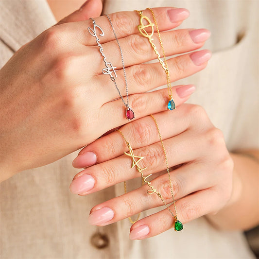 The Birthstone Collection comes in either gold or silver plated. Choose from the 12 different birthstones of choice. You may also select from a list of font styles.